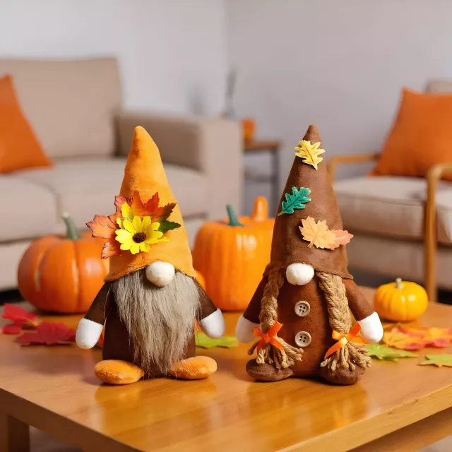 Each plush gnome features soft, high-quality fabric and durable stitching to maintain its shape season after season. The left gnome sports an orange hat and brown outfit, while the right one wears a brown hat and matching attire, both adorned with sunflower and leaf embellishments for a truly autumnal look. Standing at approximately 9.45 inches tall and 5.51 / 3.15 inches wide, they’re perfectly sized to add personality to mantels, countertops, or cozy nooks.