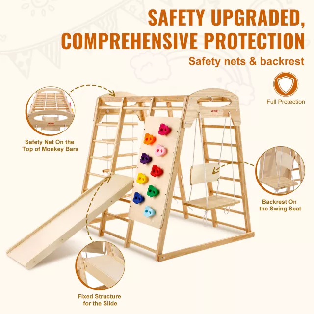 Transform your living space into a world of fun and discovery with this 7-in-1 Indoor Wooden Jungle Gym. Designed especially for toddlers, this all-in-one playground sparks imagination, builds strength, and encourages active play—all from the comfort and safety of your home. With seven exciting features including a slide, swing, monkey bars, climbing wall, wooden ladder, rope ladder, and net ladder, every day is a new adventure waiting to unfold.