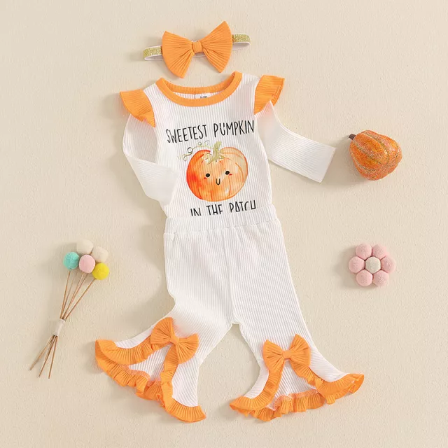 Get your baby girl ready for her first Thanksgiving in the cutest way possible! This Baby Girl Fall Outfit is the perfect mix of festive and sweet. Designed with love and crafted from soft, breathable fabric, this 3-piece set includes a cozy ribbed romper, playful ruffle flare pants, and a charming bow headband — everything your little one needs for a picture-perfect autumn look.