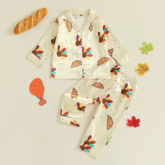 Crafted from 100% soft polyester, these pajamas offer a smooth, breathable feel that’s gentle on your child’s skin. The long-sleeve lapel shirt comes with a full button-up front, making it easy to put on and take off, while the matching pants have a comfortable elastic waistband for a snug yet flexible fit. The set features vibrant turkey prints that capture the spirit of Thanksgiving, adding a playful touch your child will love.