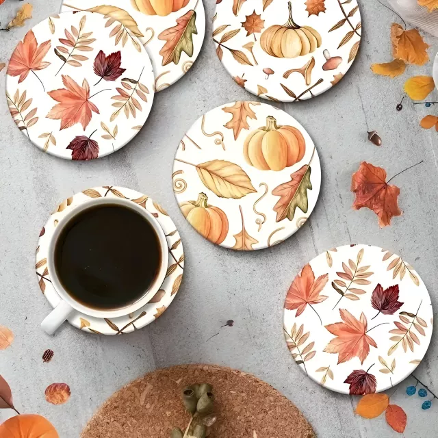 Celebrate the cozy beauty of fall with this 6-piece set of Golden Pumpkin Leaf Wooden Coasters. Designed to capture the warm hues and harvest-inspired patterns of the season, these round coasters add a charming touch to your coffee table, kitchen, or bar. Perfect for everyday use or festive occasions, they’re a delightful way to infuse your space with autumn magic.