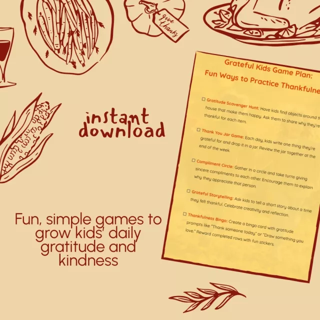 Start a new family tradition with the Grateful Kids Game Plan. Download your printable checklist today and watch thankfulness grow through fun, connection, and creativity. A simple resource with a big impact—help kids notice, name, and nurture gratitude every single day!