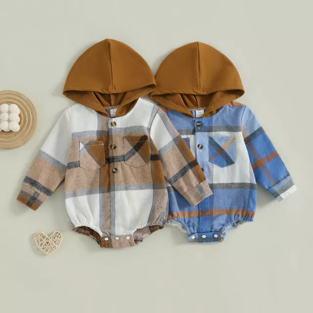 Wrap your baby boy in cozy charm this fall with our Infant Baby Boys Plaid Hooded Romper. Designed for both comfort and cuteness, this long-sleeve button-down romper is the perfect outfit for crisp autumn days. The soft plaid pattern adds a timeless touch, while the hood keeps your little one warm and snug during outdoor strolls or family gatherings. Whether it’s a casual day at home or a fun outing, this romper is made to keep your baby comfy, stylish, and photo-ready.