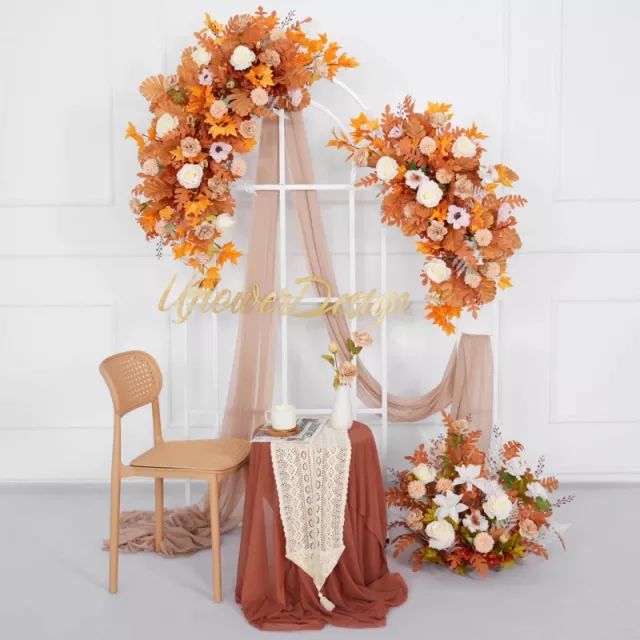 This floral arrangement shines brightest during weddings, seasonal celebrations, and outdoor exhibitions. Use it as a centerpiece for arches, windows, backdrops, or table runners to create a romantic, nature-inspired look. Its rich orange hues and maple accents make it especially fitting for autumn weddings and rustic-themed events.