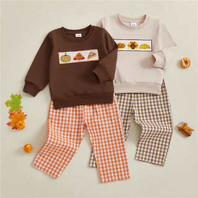 This sweet fall outfit features an adorable embroidered pumpkin turkey design on a cozy sweatshirt made from 95% cotton and 5% elastane — gentle on baby’s skin, stretchy, and breathable for all-day play. The soft plaid pants have a comfortable elastic waistband for easy dressing and unrestricted movement, perfect for active toddlers. Available in Apricot and Coffee colors, it’s a unisex choice that suits any little one’s festive wardrobe.