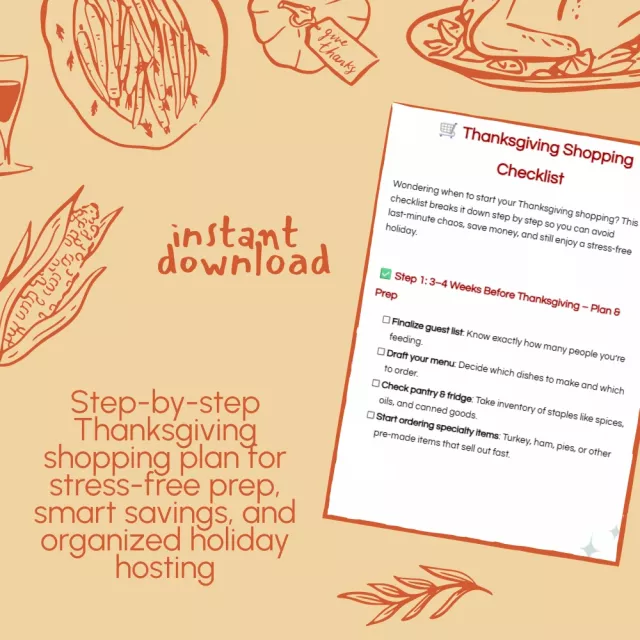 Wondering when to start your Thanksgiving shopping? The Thanksgiving Shopping Checklist is your ultimate step-by-step guide to stress-free holiday planning. Whether you’re hosting your first Thanksgiving dinner or managing a full house, this printable digital download helps you organize every detail — from pantry staples to fresh ingredients — so you can save money, avoid last-minute grocery runs, and enjoy more time with family and friends. Designed for busy hosts, it breaks down what to buy and when, making Thanksgiving prep simple, efficient, and totally manageable.