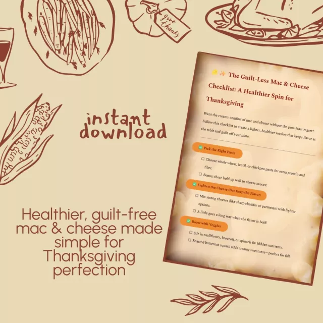 This digital checklist isn’t just about cutting calories—it’s about elevating your mac and cheese with flavor, nutrition, and festive flair. Stop guessing how to make healthier mac and cheese for Thanksgiving and start creating a dish that’s both satisfying and smart.